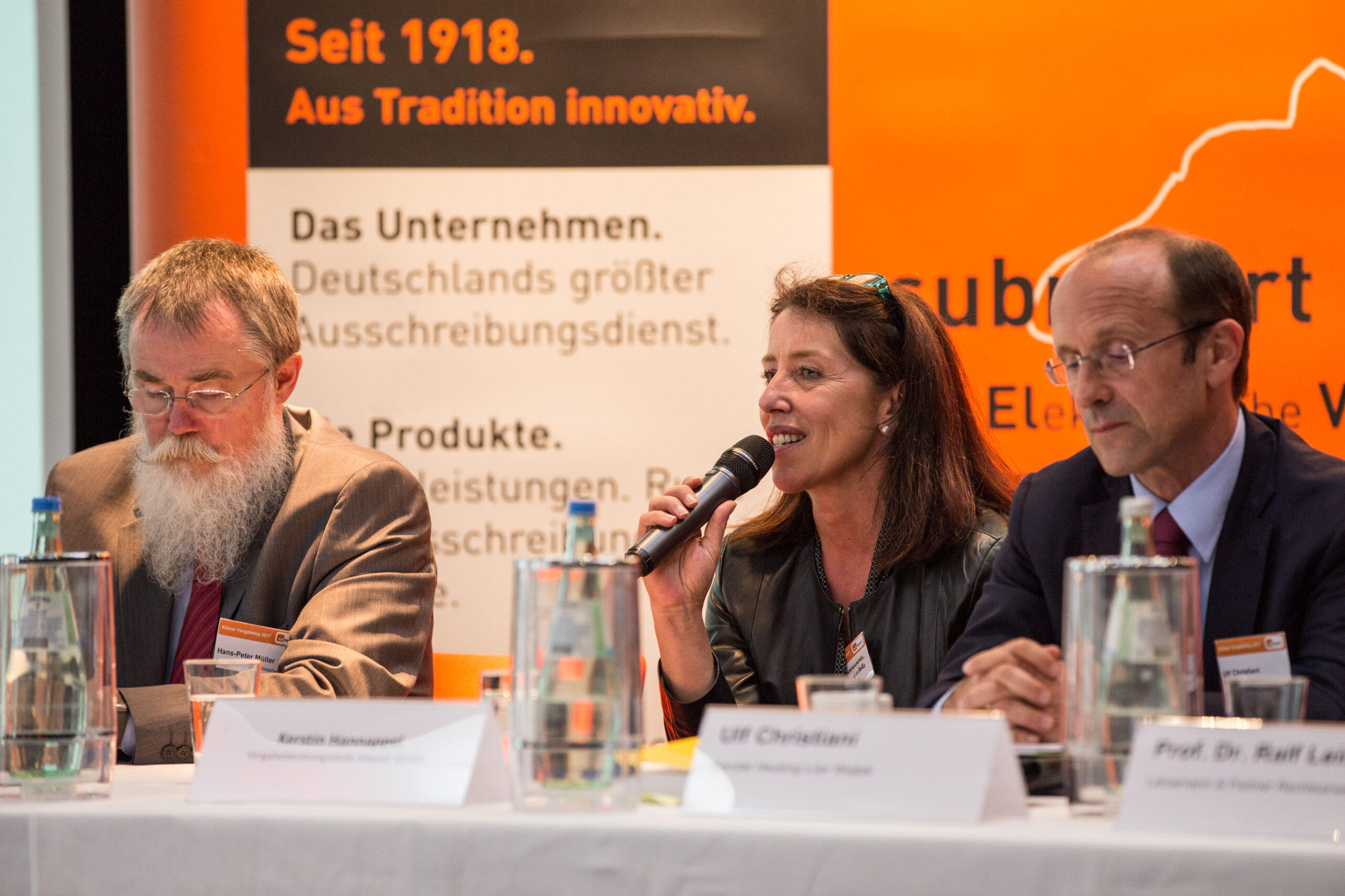 Der zweite Teil der Veranstaltung stand wie jedes Jahr beim Kölner Vergabetag ganz im Zeichen von Austausch und Dialog: Im Anschluss an eine Podiumsdiskussion richtete sich der Fokus auf die Teilnehmer im Plenum, die nun ihre Fragen, Anmerkungen und Kritikpunkte in einem intensiven Diskurs mit den Referenten anbringen konnten.